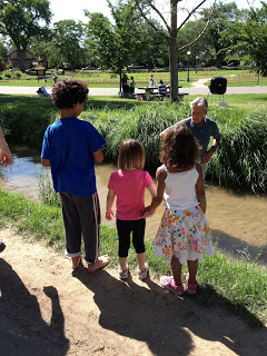 Mr. B, being the kind soul he is, agreed to use the proceeds from his hard-earned selling to donate to our local firefighters. We walked over to the firehouse a few days later, $22.70 swaying in an envelope, and B mustered up the courage to walk over to a very sturdy fireman and say "I raised this money for you." The firefighter looked down at Mr. B, a little touched by the gesture, and said" Ah, buddy, that's sweet, but we can't take your money." I guess they can't directly take a donation, so we're going to bring it over to the Denver Firefighter's Museum and donate it to restore their antique fire engine that caught fire in early May. Still, the guys were pretty nice, talked to the kids a little, and even gave them some plastic hats. I'm always amazed at the level of patience, compassion, and generosity these firefighters have. We also got in one last picnic in our nearby park, spending the day with good friends, finally letting Miss P and Mr B take a ride in the paddle boats they'd been drooling over all spring, and even letting them fling themselves in to the creek that I swore I'd never let them touch. Thankfully, we escaped without a case of giardia...